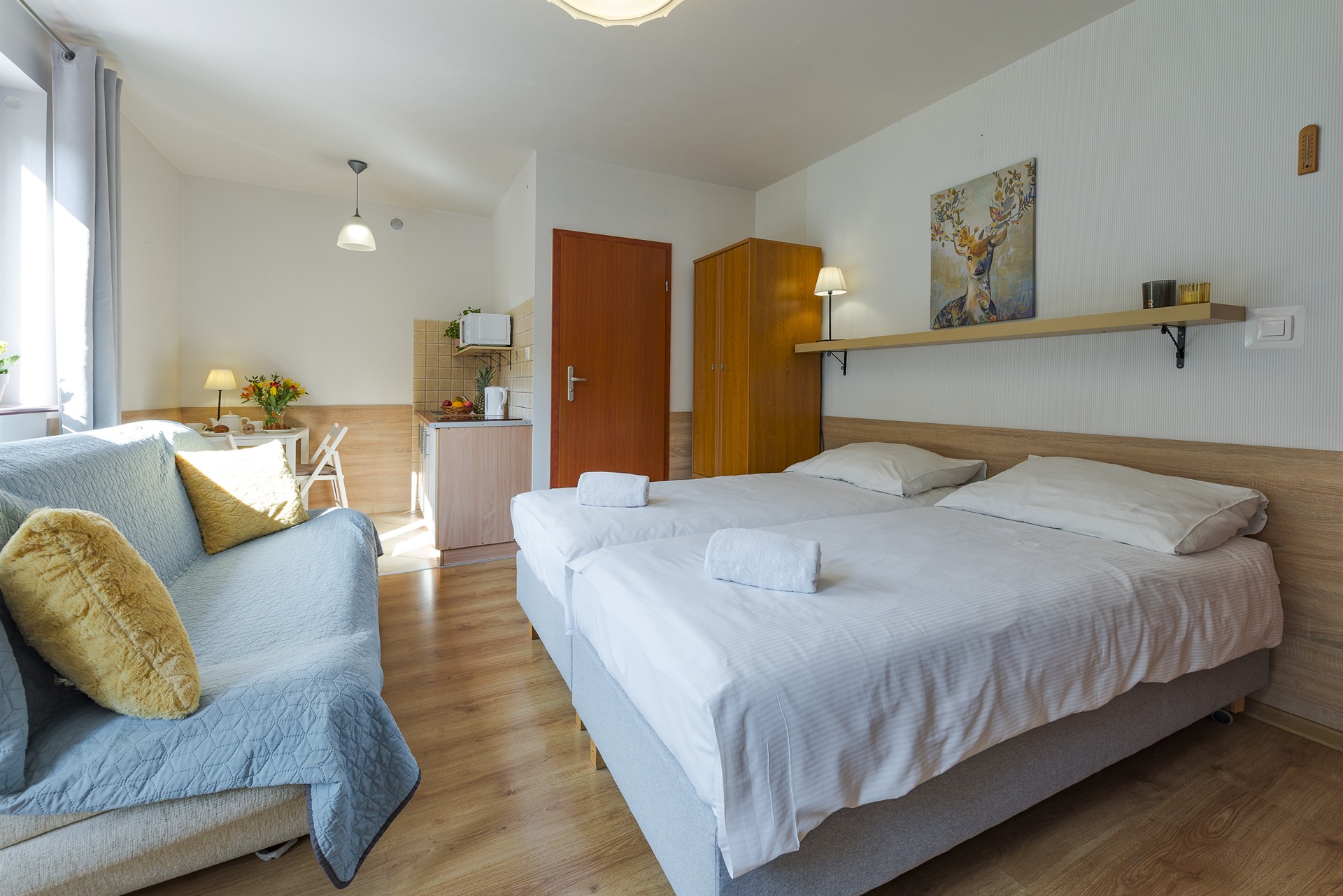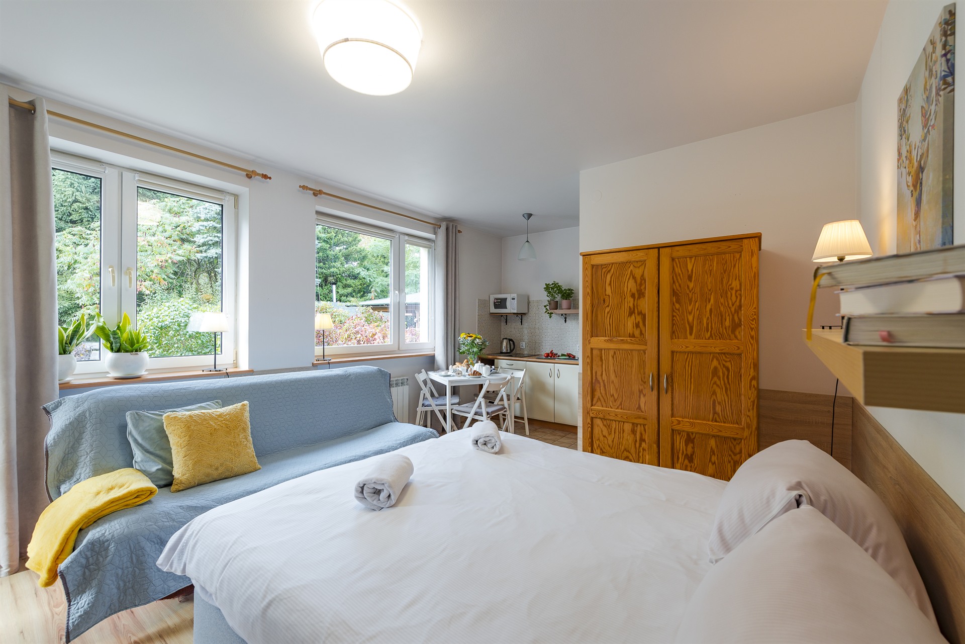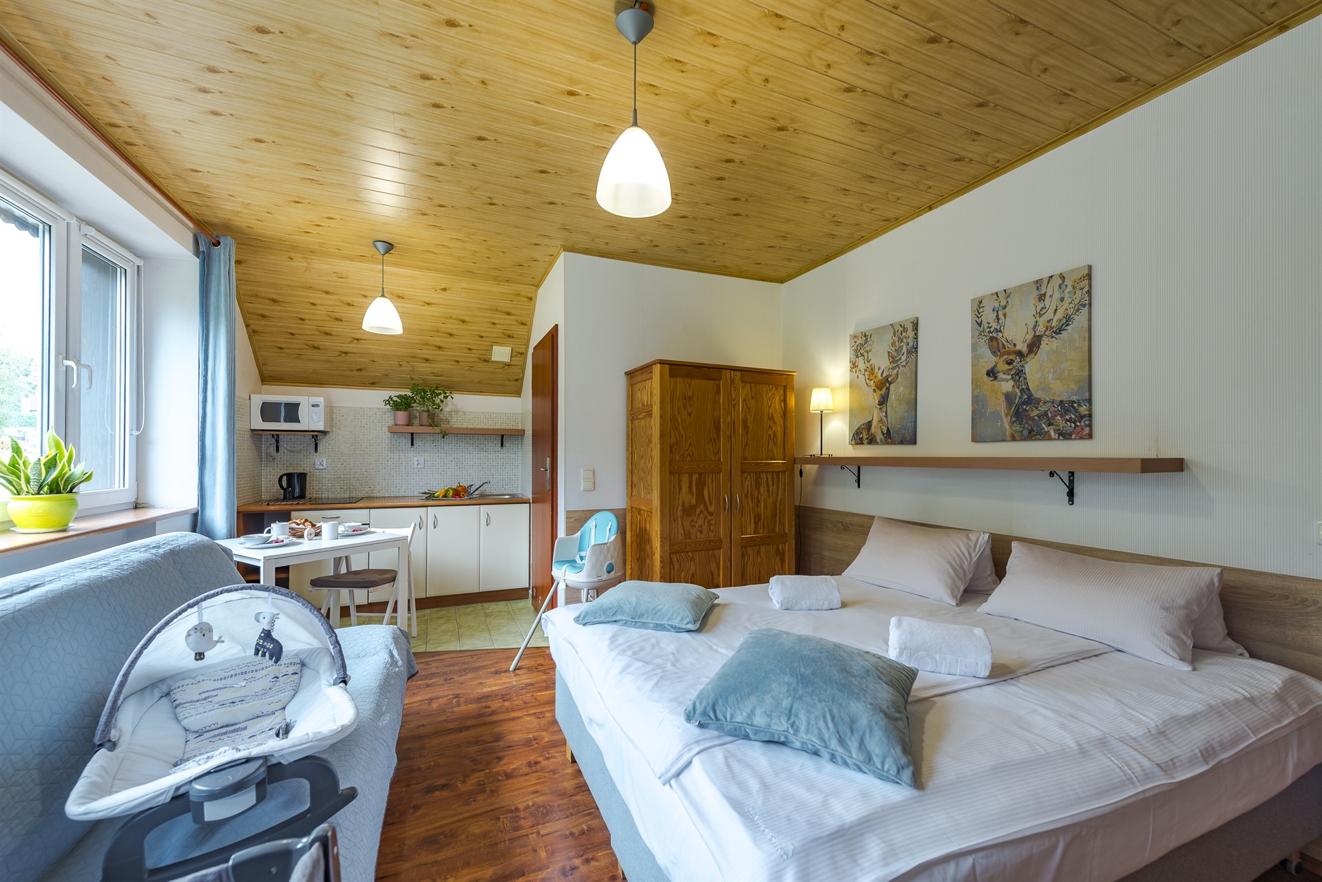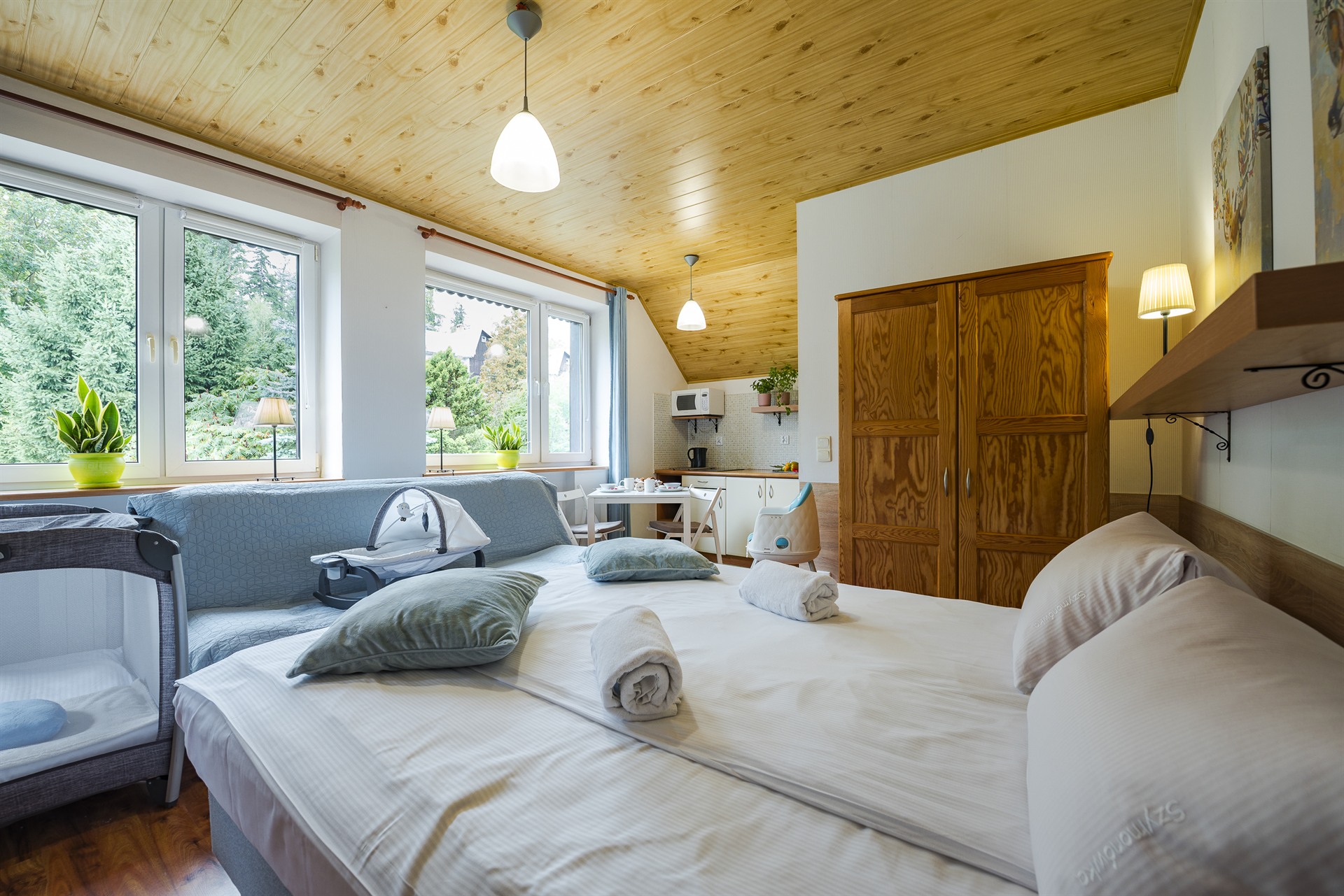 Przestronny pokój rodzinny o powierzchni 20 m² to idealne rozwiązanie dla par z dziećmi lub grupy przyjaciół. Wnętrze zostało zaprojektowane tak, by łączyć komfort z funkcjonalnością – do dyspozycji gości jest wygodne łóżko podwójne lub dwa pojedyncze oraz rozkładana kanapa typu wersalka, która zapewnia dodatkowe miejsca do spania. Pokój wyposażony jest w prywatną łazienkę oraz praktyczny aneks kuchenny, a dodatkowym atutem jest balkon lub bezpośrednie wyjście na taras, skąd można podziwiać widok na las lub górskie panoramy.