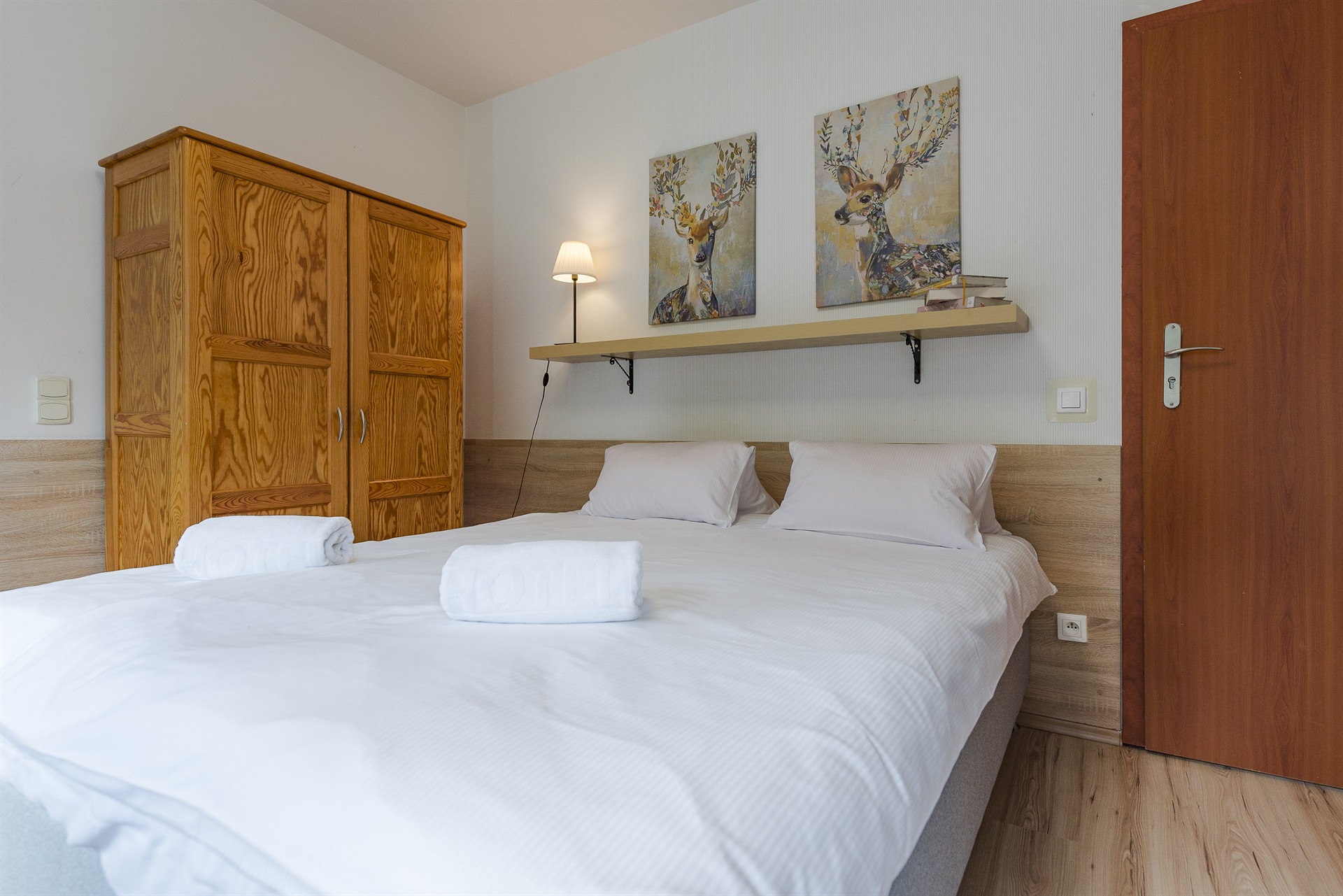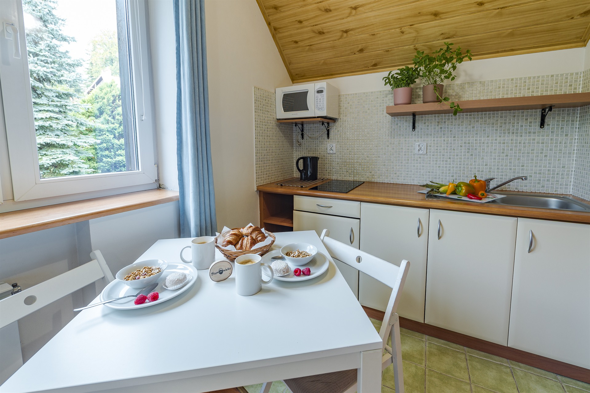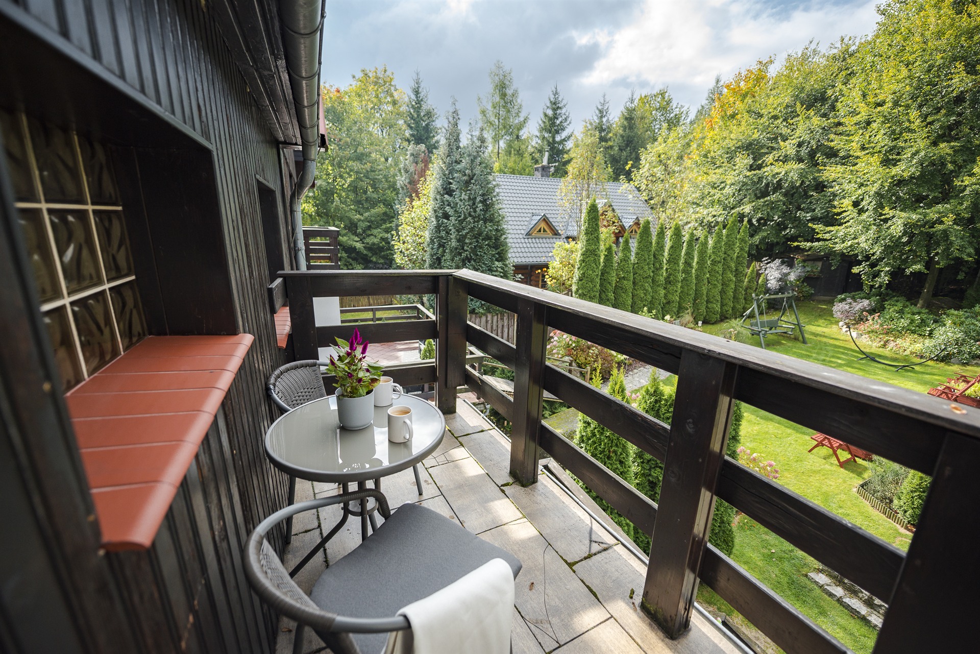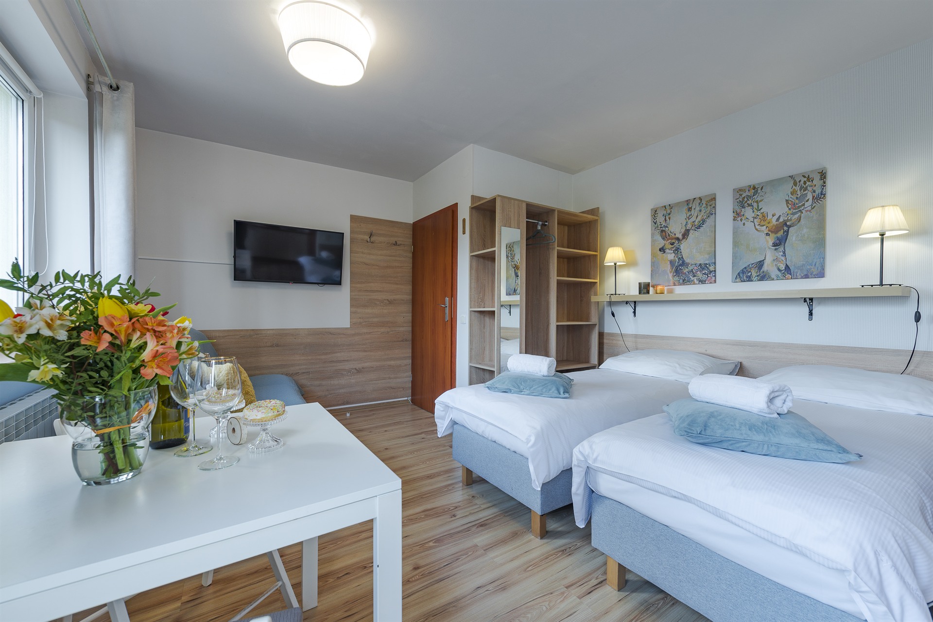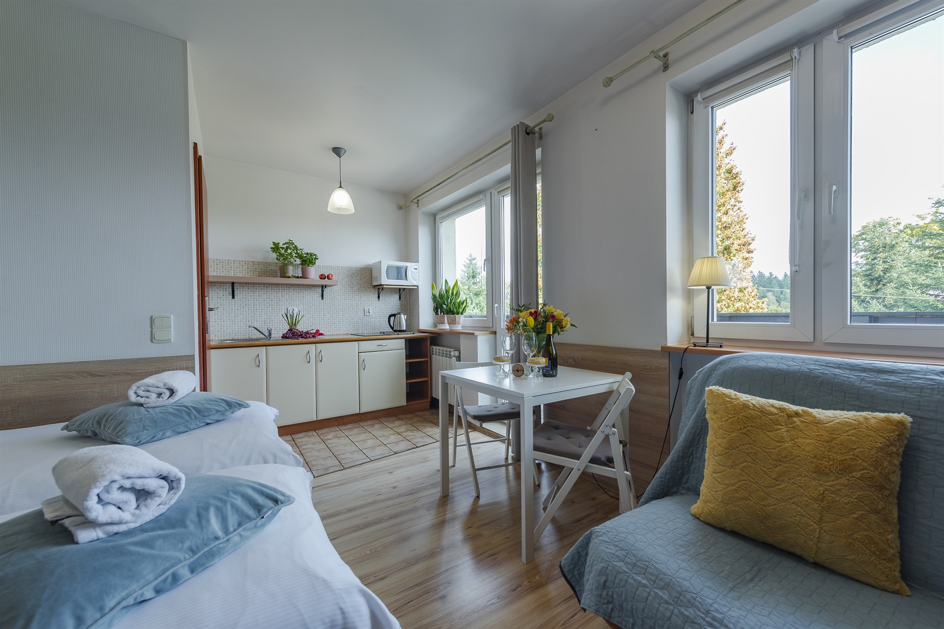 Przestronny pokój rodzinny o powierzchni 20 m² to idealne rozwiązanie dla par z dziećmi lub grupy przyjaciół. Wnętrze zostało zaprojektowane tak, by łączyć komfort z funkcjonalnością – do dyspozycji gości jest wygodne łóżko podwójne lub dwa pojedyncze oraz rozkładana kanapa typu wersalka, która zapewnia dodatkowe miejsca do spania. Pokój wyposażony jest w prywatną łazienkę oraz praktyczny aneks kuchenny, a dodatkowym atutem jest balkon lub bezpośrednie wyjście na taras, skąd można podziwiać widok na las lub górskie panoramy.