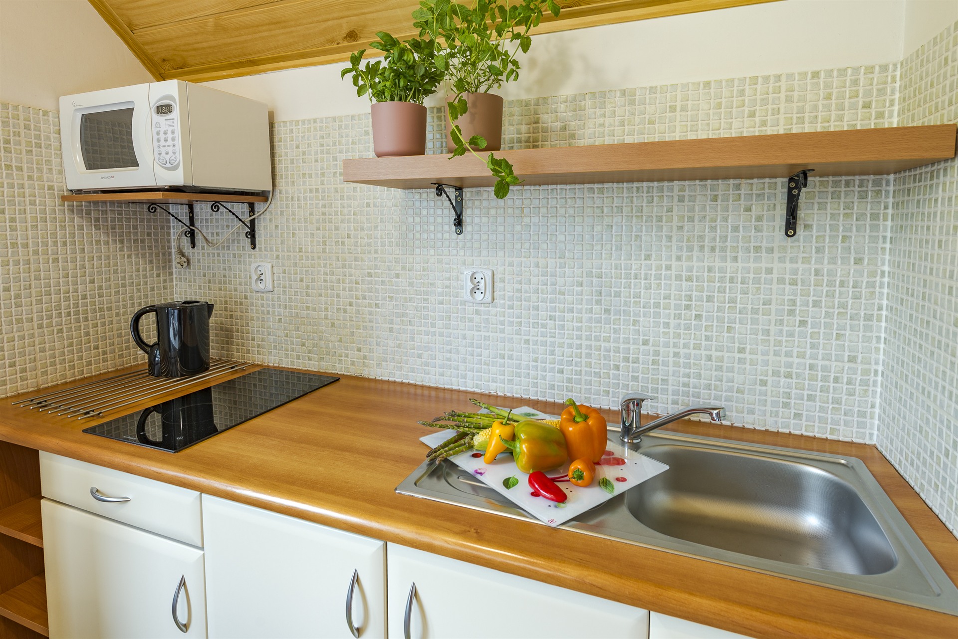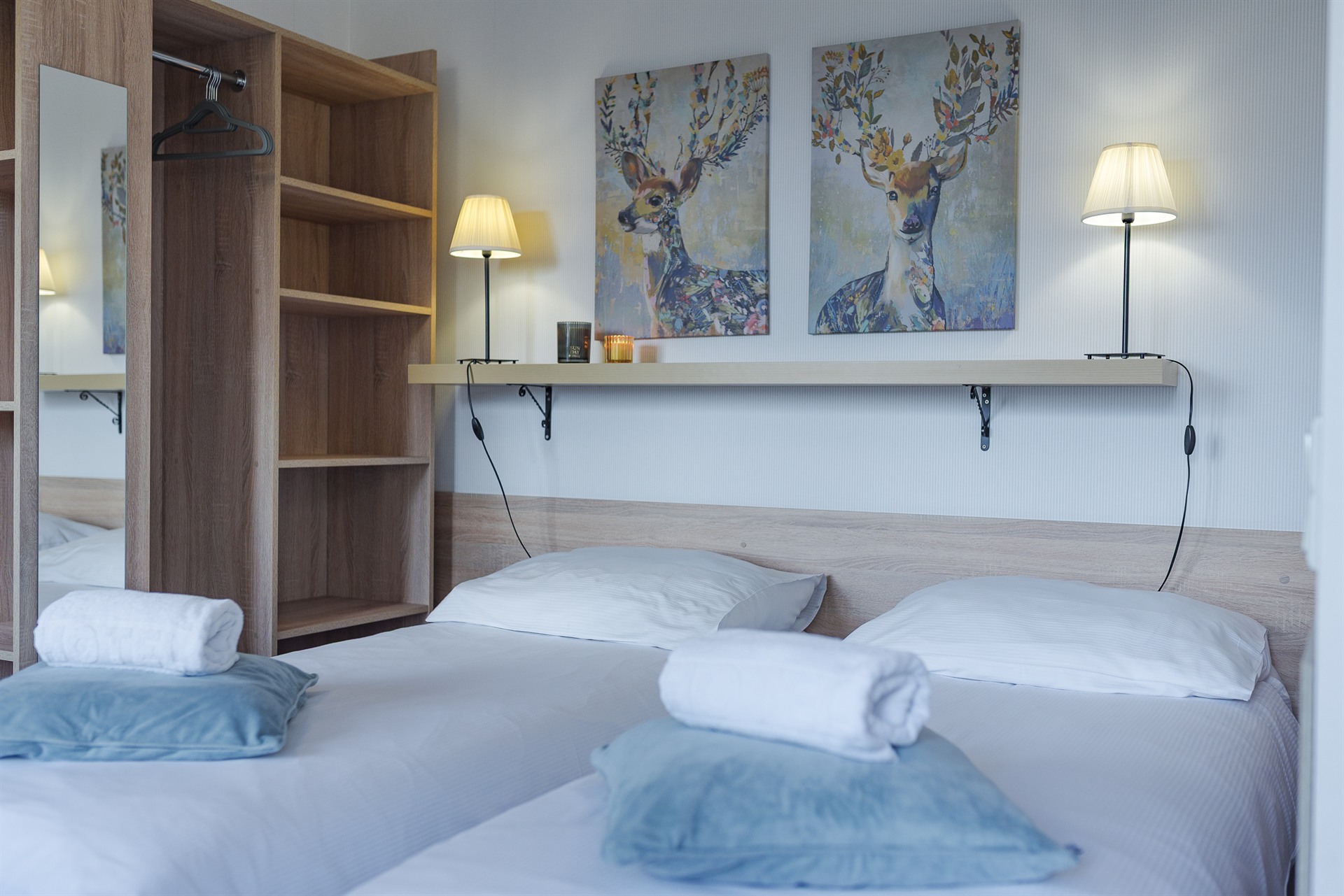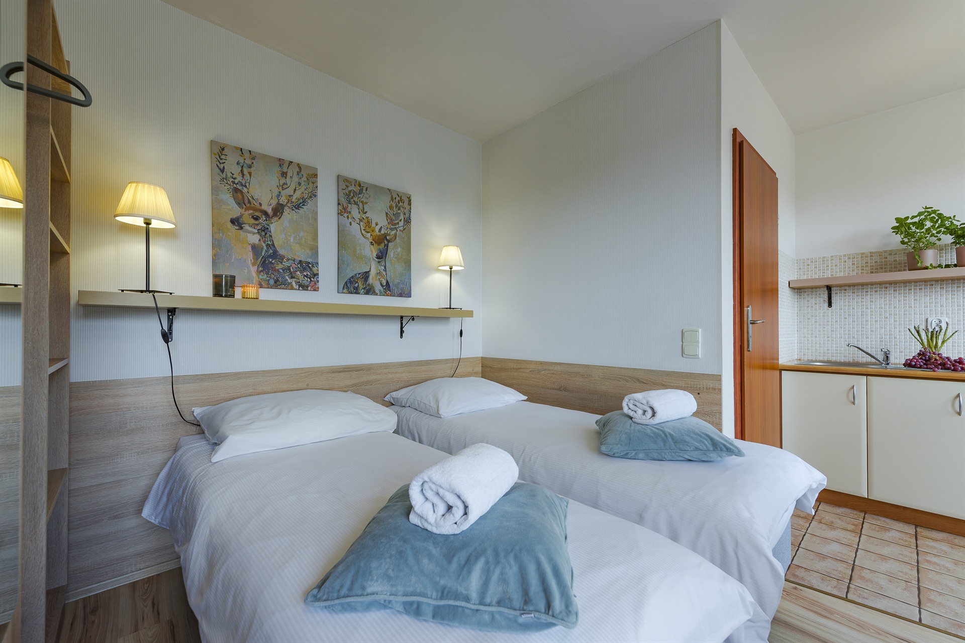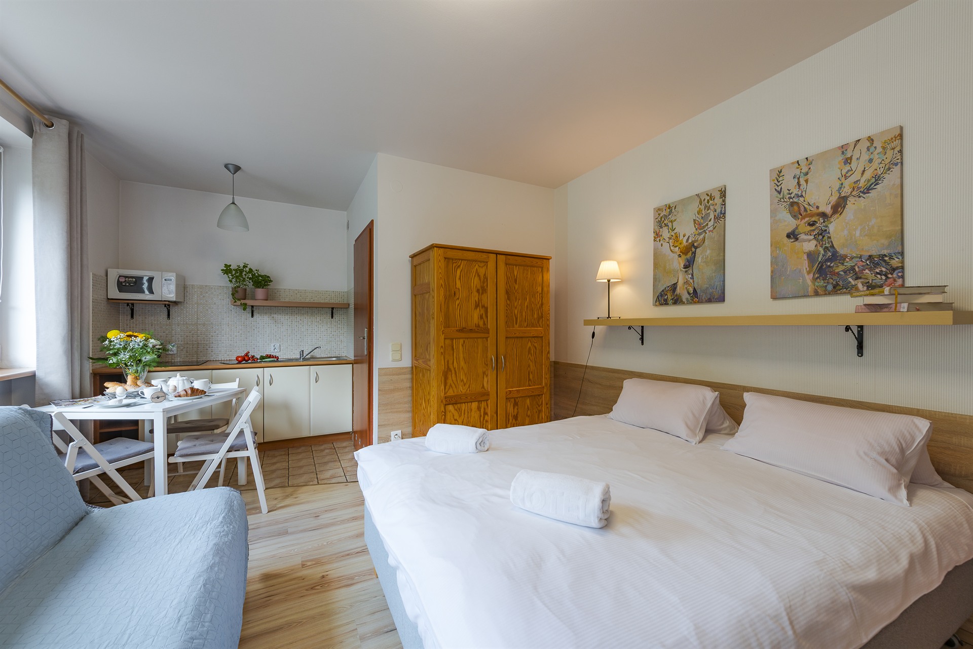 Przestronny pokój rodzinny o powierzchni 20 m² to idealne rozwiązanie dla par z dziećmi lub grupy przyjaciół. Wnętrze zostało zaprojektowane tak, by łączyć komfort z funkcjonalnością – do dyspozycji gości jest wygodne łóżko podwójne lub dwa pojedyncze oraz rozkładana kanapa typu wersalka, która zapewnia dodatkowe miejsca do spania. Pokój wyposażony jest w prywatną łazienkę oraz praktyczny aneks kuchenny, a dodatkowym atutem jest balkon lub bezpośrednie wyjście na taras, skąd można podziwiać widok na las lub górskie panoramy.